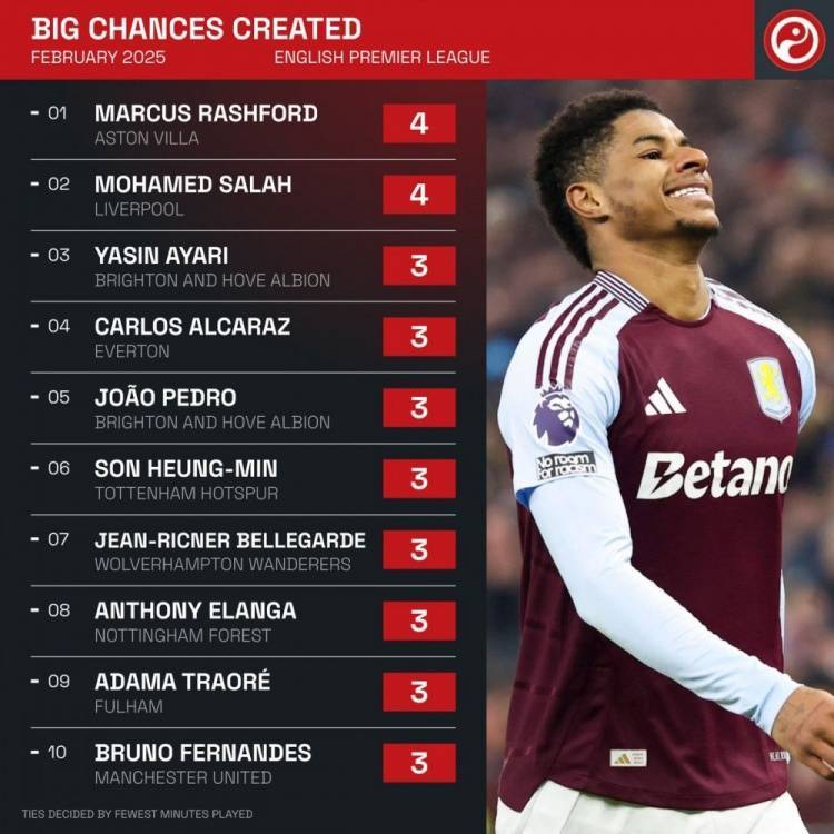 直播吧3月1日讯 英超2月比赛已经完赛,数据统计显示拉什福德创造重大机会数并列最多,而他期间共计仅出场179分钟。