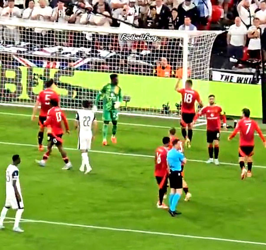 比赛开局阶段,曼联后卫卢克·肖将热刺的边路进攻踢出底线,送给对手一次角球。奥纳纳在球门前的喋喋不休,似乎引发了卡塞米罗的不满,他指着球门示意守门员好好做好自己的工作。随后,两人进行了一阵激烈的争吵。